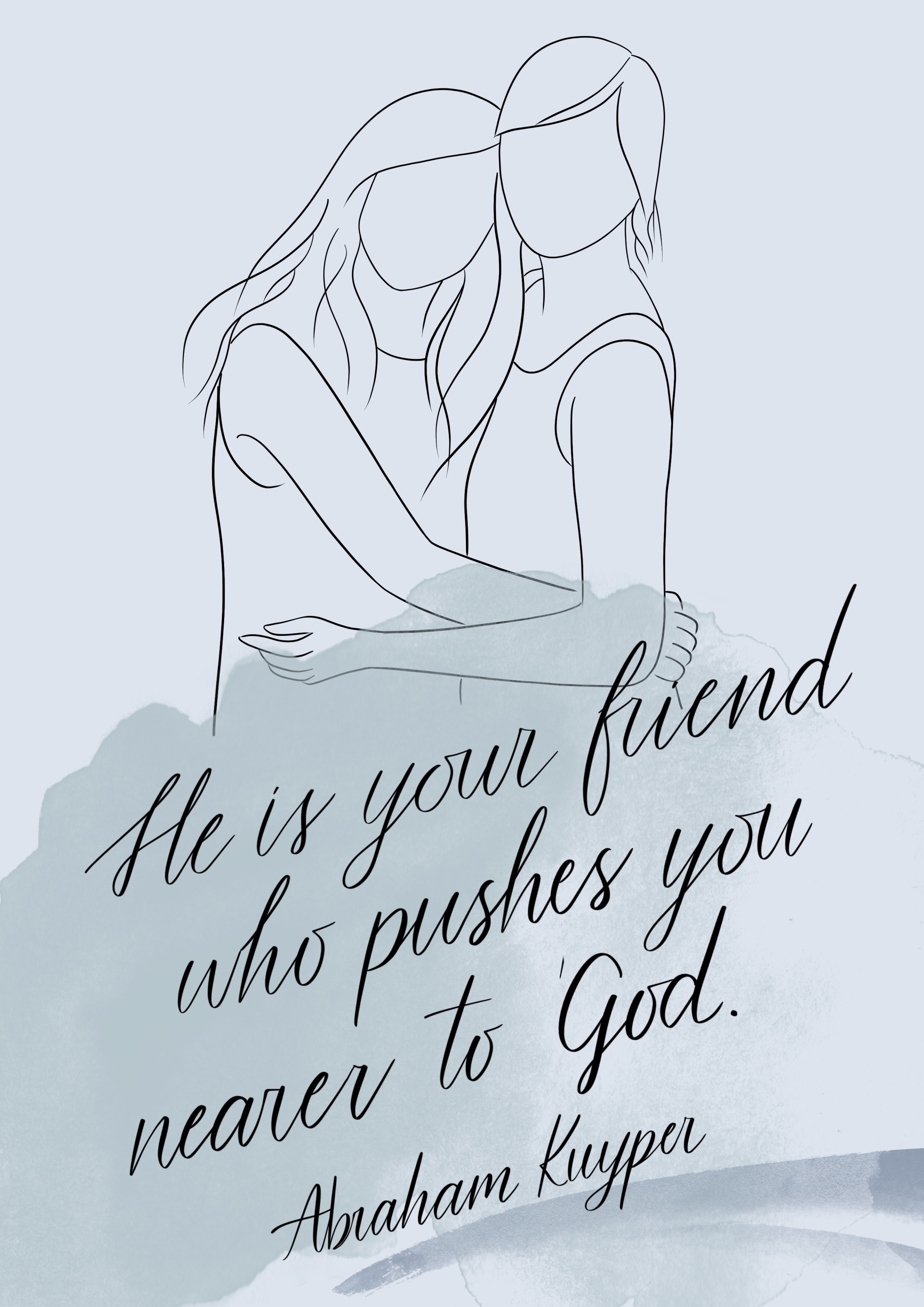 I had so much fun creating this piece as an inside-page artwork for Kallos Magazine’s issue of friendship. They wanted an artwork that featured the quote, “He is your friend who pushes you nearer to God. – Abraham Kuyper”, and the illustration was drawn based off images of the members of this magazine. Below are the final product (in blue), and a few preliminary sketches.
